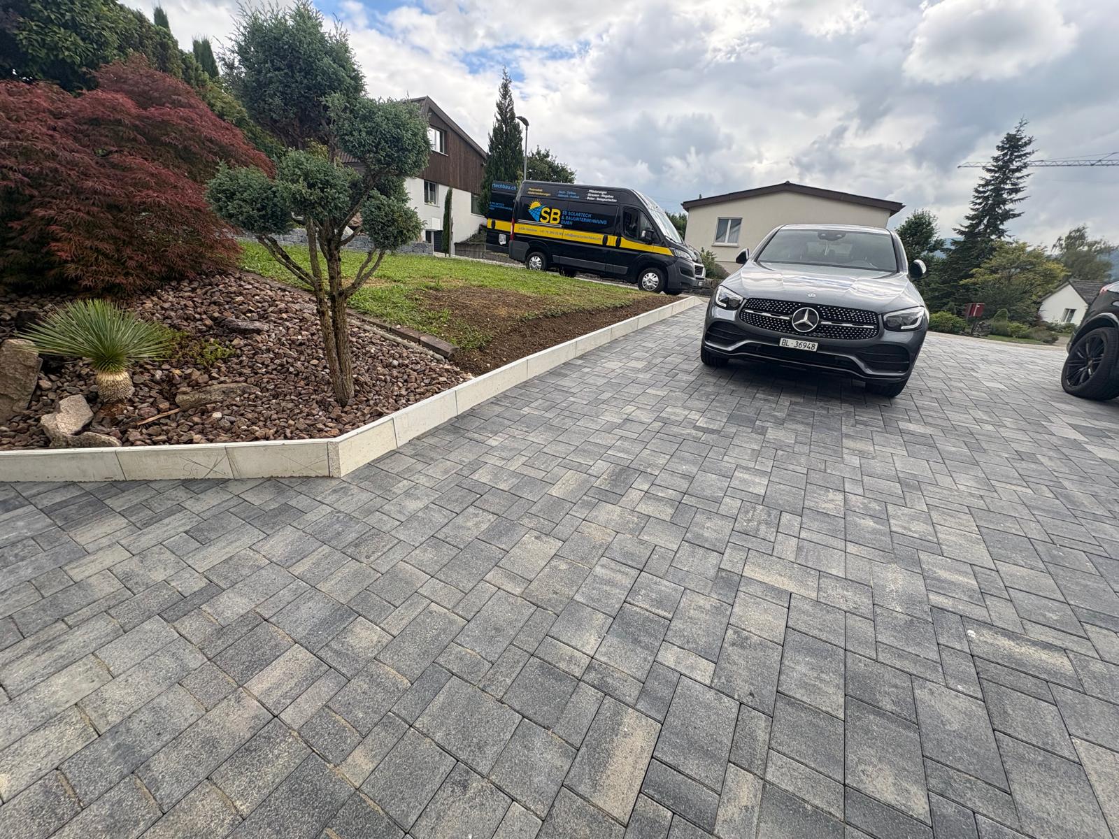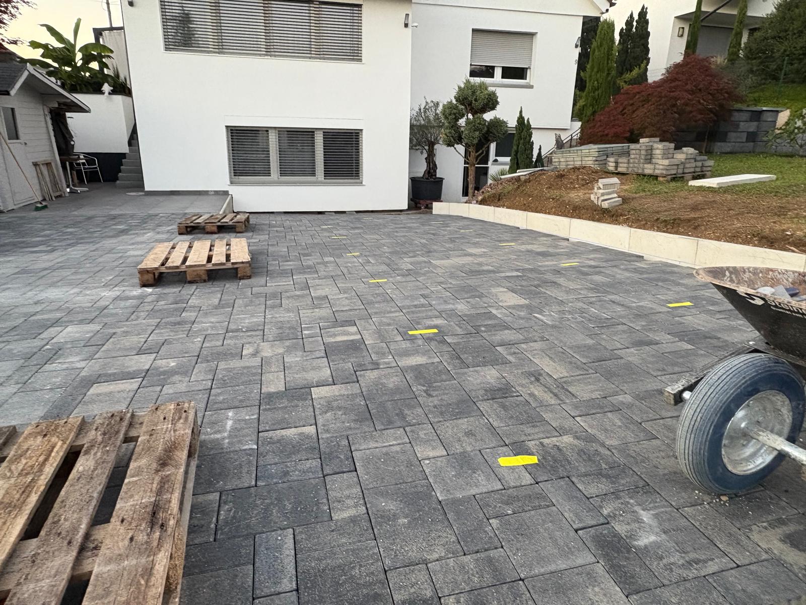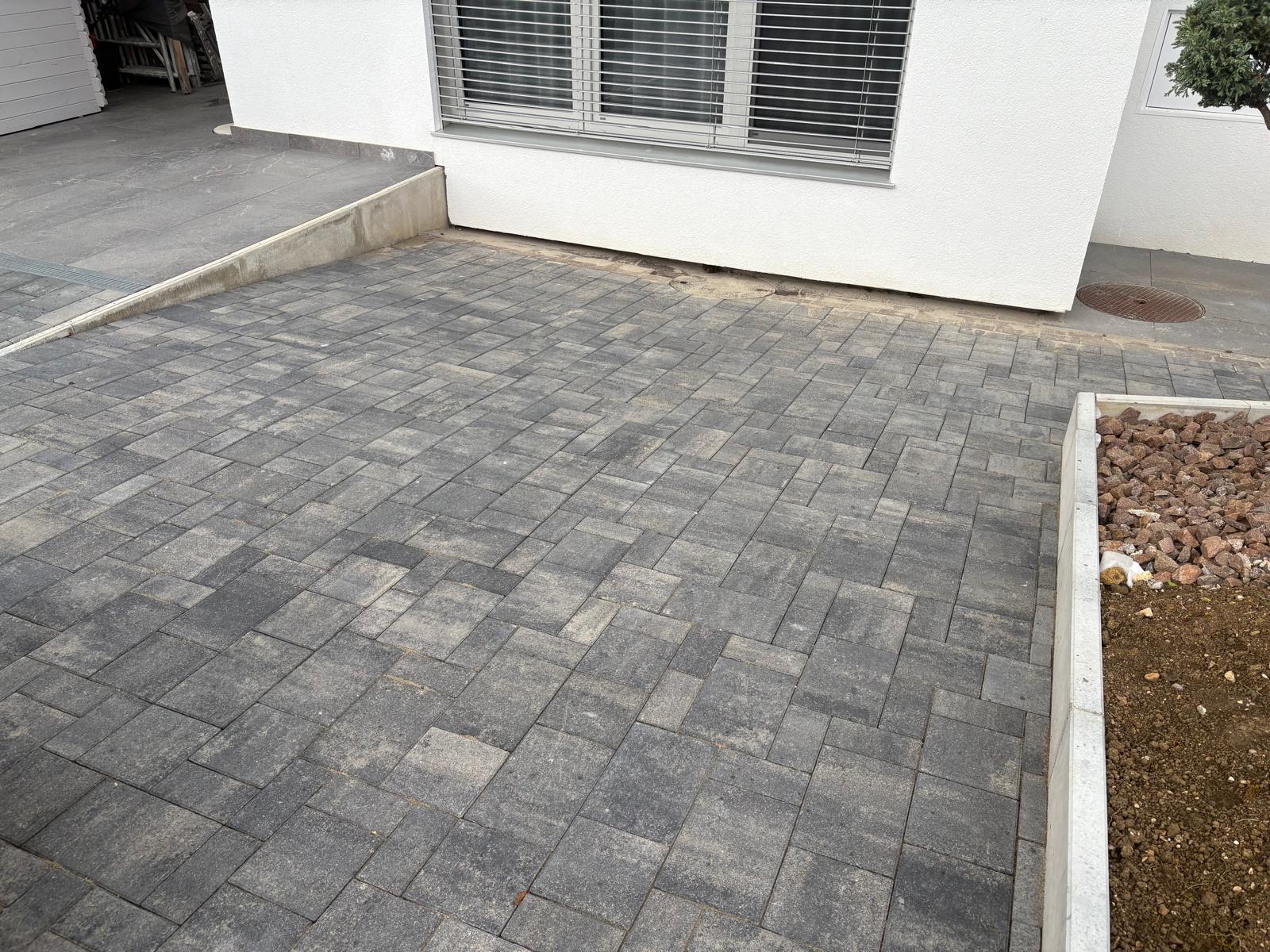 Für die Familie Catello durften wir in Hölstein die komplette Hauseinfahrt sowie den Parkplatz neu gestalten. Der bestehende Belag wurde entfernt und der Untergrund fachgerecht ausgehoben. Nach der Entsorgung des alten Materials entstand eine neue Fundationsschicht, die den Aufbau langfristig stabil trägt. Auf insgesamt 120 Quadratmetern wurden neue Verbundsteine verlegt. Dazu kamen fünfzehn Meter Stellplatten und verschiedene Anpassungsarbeiten, damit die gesamte Fläche sauber anschliesst und ein harmonisches Gesamtbild entsteht. Das Resultat ist eine moderne und funktionale Einfahrt, die optisch überzeugt und den Alltag der Familie spürbar erleichtert.